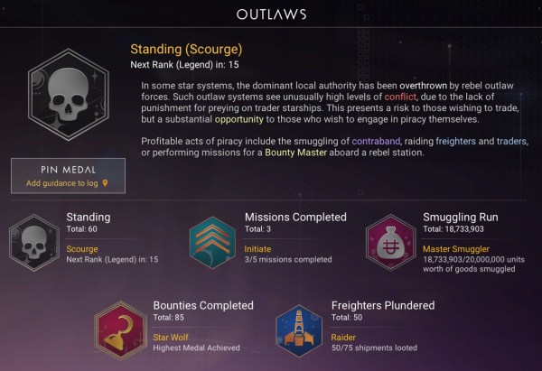 Cool look, the whole Atlas thing… but I am inevitably distracted by… just about anything. I find a planet type I haven’t seen before or I feel the need to stop and check in at every station to talk to the locals. That gets me a bit further along in all of those milestone. Granted, I am already exalted, or whatever the final rank is, with each of the primary lifeforms.