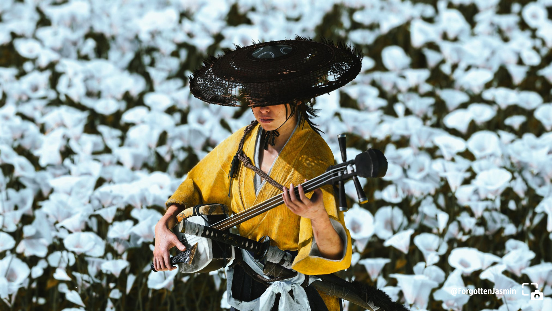 ForgottenJasmin shares Atsu strumming her shamisen in a field of white lilies.