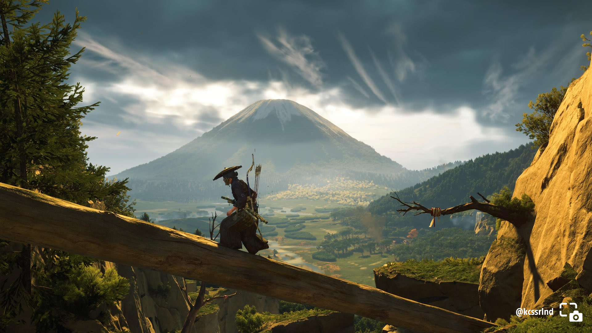 kcssrlnd shares Atsu running across a fallen tree trunk with Mount Yōtei in the background.