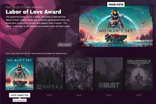 Last year NMS got robbed by Baldur’s Gate 3, which was barely old enough to have had any post-launch labors at that point. It is like these popularity contests are just popularity contests or something. Anyway, we’ll see if Larian using AI for… whatever they are claiming now… changes the equation.